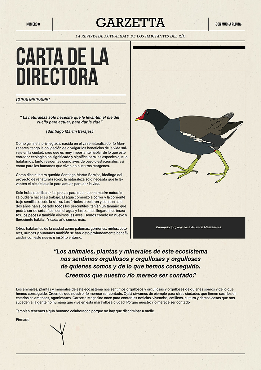 Su directora es una Gallineta común que nació en el ya renaturalizado río Manzanares y bajo una irónica mirada ecologista se hace esta revista, con plumas invitadas, noticias de actualidad ya sea del río o de la ciudad o de otras aves de paso que cuentan su experiencia o denuncian actuaciones humanas nocivas para el medio.