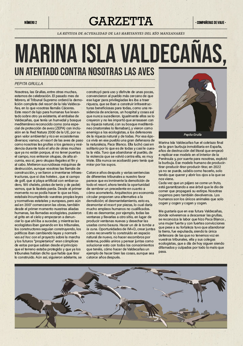 Su directora es una Gallineta común que nació en el ya renaturalizado río Manzanares y bajo una irónica mirada ecologista se hace esta revista, con plumas invitadas, noticias de actualidad ya sea del río o de la ciudad o de otras aves de paso que cuentan su experiencia o denuncian actuaciones humanas nocivas para el medio.