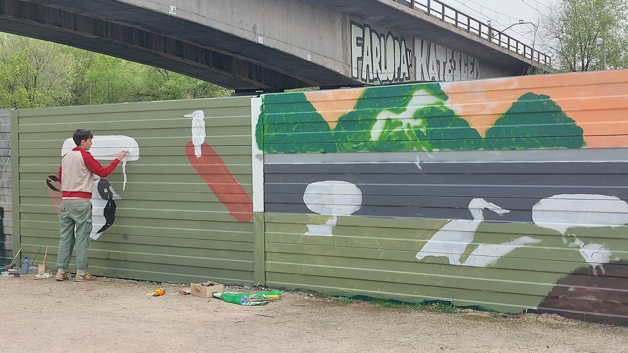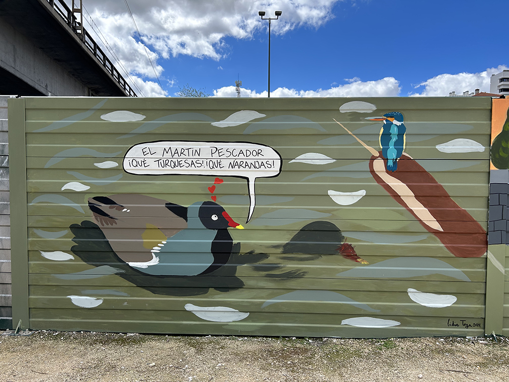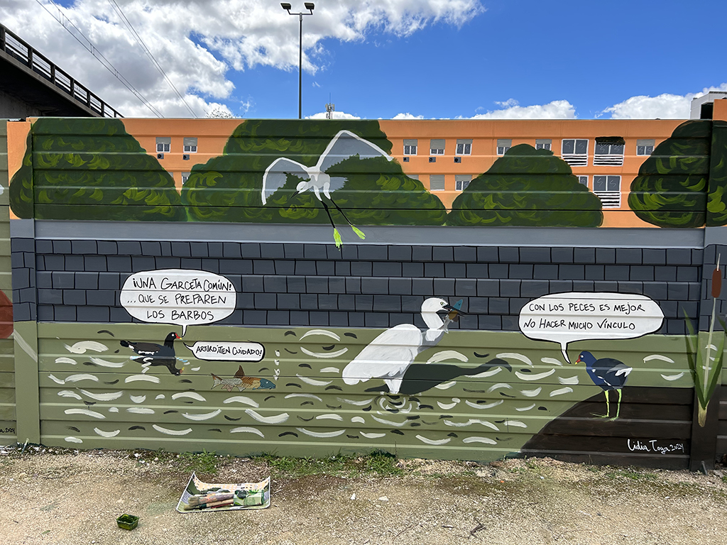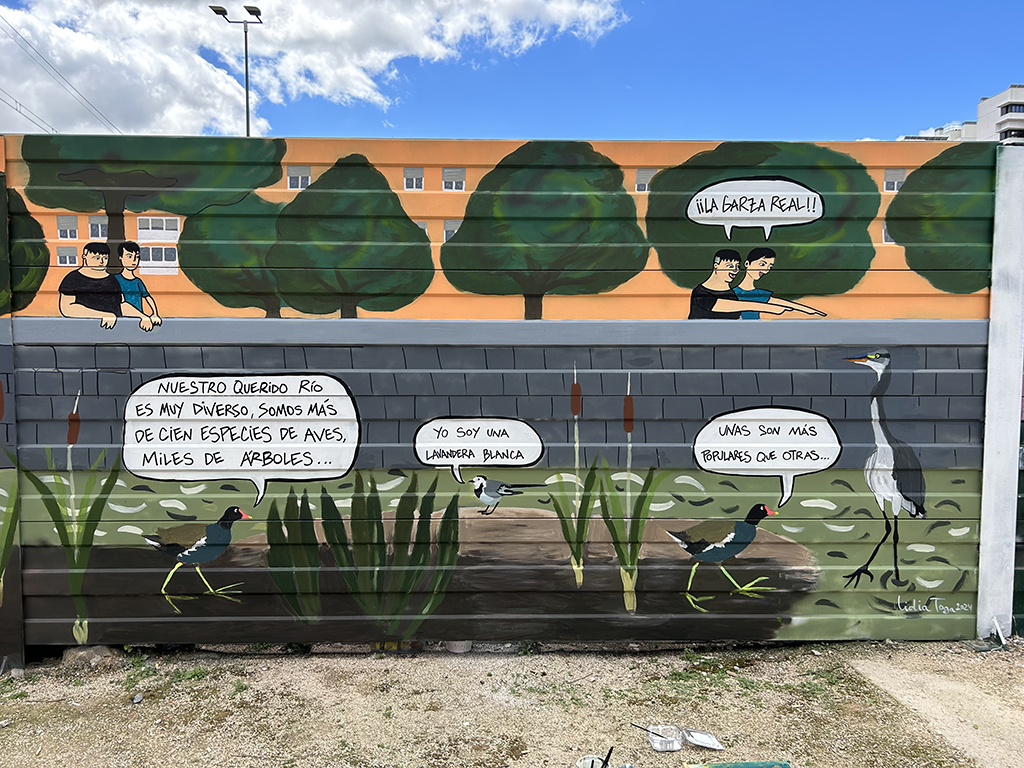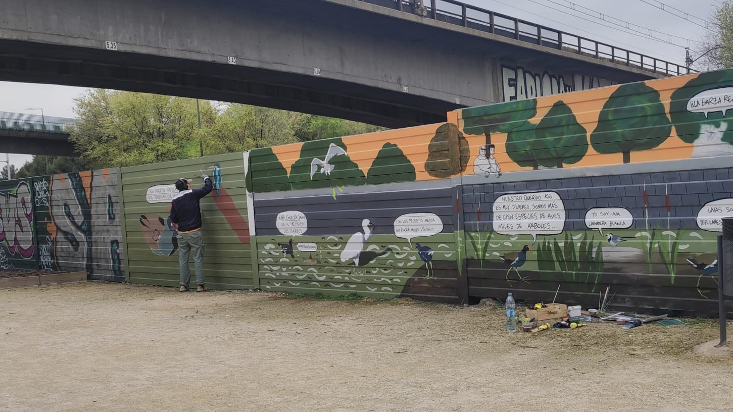 Mural encargado por el Ayuntamiento de Madrid para adornar las pantallas de separación de la M30 y contar a la ciudadanía en lo que se está convirtiendo el río Manzanares tras la renaturalización de este en 2016